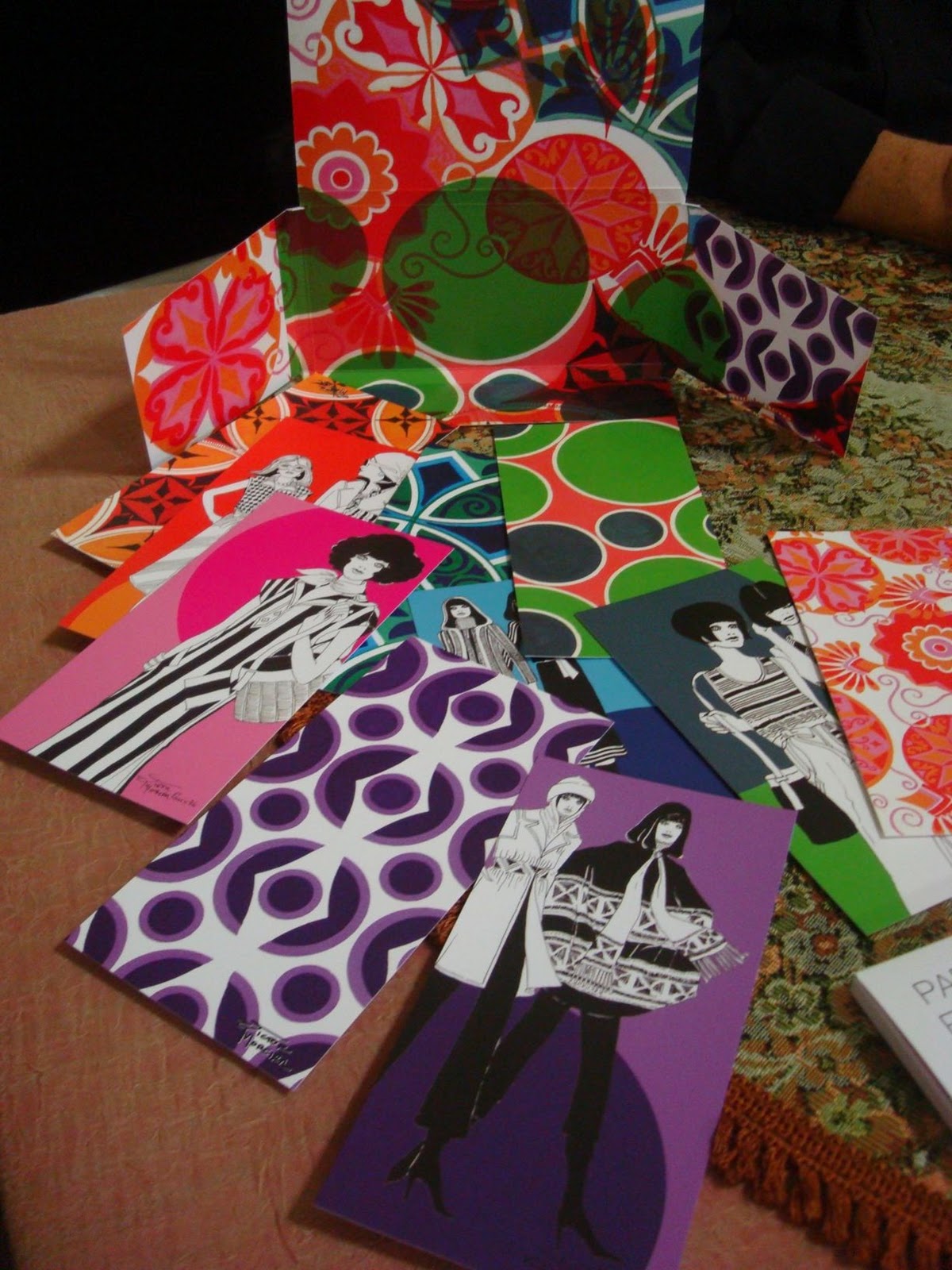 Nesta reunião, Izabella apresentou os trabalhos de estamparia feitos à mão por Victor Moreira, que são retratados em nossos cartões. Imediatamente, Pujalet-Plaa decidiu incluir a coleção de postais do LI.TER.ATO "Paris em Círculos", que traz croquis da coleção criada por Victor na Paris de 1976 ao acervo da biblioteca do museu.